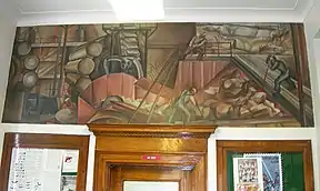 Having had an interest in making murals from an early age, Ludins observed examples of the muralist movement in Mexico City during travels in the late 1920s. With a referral from Diego Rivera in hand, she returned to Mexico in 1933 to become an assistant to the Mexican-American muralist, Pablo O'Higgins.[27] 'Higgins taught her the fresco technique of mural making and helped her get her first mural commission. This was a work for the official newspaper of the political party that controlled Mexico from 1929 to 2000.[28] The commission led to others, including, in 1934, a fresco called "Modern Industry" for the State Museum at Morelia.[1][26][29] A photo of what is probably this fresco is shown above.