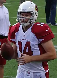 On November 11, 2014, Lindley re-signed with the Arizona Cardinals after a season-ending injury to Carson Palmer. On December 11, 2014, starting quarterback Drew Stanton was injured in the game against the St. Louis Rams, Lindley entered the game and saw his first in-game action since 2012. On December 28, 2014, against the San Francisco 49ers, Lindley threw his first career touchdown pass to Michael Floyd, ending an NFL-record 228 pass attempts without a touchdown to start his career.[6] He finished the 2014 season with a 48.4% completion rate, 562 yards passing, 2 touchdowns, 4 interceptions, and a 56.8 passer rating.[7]