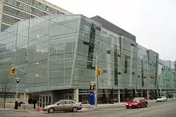 Ryerson University Library serves as the main academic library for the university, and is housed in an 11-storey Brutalist-style structure that was completed in 1974.[56] As of 2012, the library's collection held over 522,000 books, over 836,000 microform units, and provide access to electronic resources including e-books, serial titles, and databases.[57] In 2015, the Student Learning Centre was completed adjacent to the library building.[58] The 14,200 square metres (153,000 sq ft) Student Learning Centre was designed by the architectural firm Snøhetta, and was built to augment the library by providing additional study space; although no books from the university's collection are stored in the Student Learning Centre.[56][58]