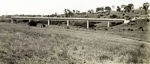 Four road bridges have spanned the Cudgegong River which flows through the town. The first bridge was a suspension bridge that was washed away by floods around 1867. This was followed by a second bridge of two spans built by a Mr Hayden soon after the flood. This second bridge was alongside the first bridge at the end of Hall Street. A third bridge built by Mr Eddy Fitzgerald replaced the second in 1890 and was a little further up the River. The fourth bridge, and the only one remaining, which is still used today was built in 1948 to line up with the Bylong Road. A railway bridge also spans the Cudgegong River approximately 100 metres upriver of the present road bridge. This apart from upgrading works, to add additional centre pillars, is the original structure built during the construction of the line.[2]