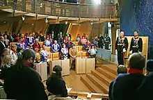 The Sámi Act (1987:56),[3] stipulating the responsibilities and powers of the Norwegian Sámi Parliament, was passed by the Norwegian Parliament on 12 June 1987 and took effect on 24 February 1989. The first session of the Sámi Parliament was convened on 9 October 1989 and was opened by King Olav V.