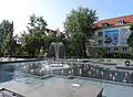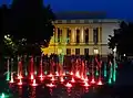 On the front square of the Philharmonic has been built in the 1970s a pipe organ-shaped fountain. The plot is surrounded by the Pomeranian Philharmonic, the building of the Music Schools Group and Słowackiego Street. The fountain was entirely rebuilt in 2014 and unveiled on 23 May. Works have been sponsored by the philanthropy of the Municipal Water Supply and Sewerage Company[12] and European Union funds. From April to October, 3 days per week in the evening (2130-2200), the fountain shows an artistic performance combining games of water, light and music during a 25-minute session. Many famous pieces of classical music are performed in this way (from Tchaikovsky, Beethoven or Johann Strauss I).[13]