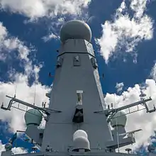 Whilst this may seem to be a disadvantage, the SAMPSON radar rotates at 30 revolutions per minute, with two back-to-back arrays, meaning no part of the sky lacks coverage for more than one half second on average - the precise time varies as the beams can also be swept back and forth electronically. In addition, the use of a smaller number of arrays allows the system to be much lighter, allowing placement of the arrays at the top of a prominent mast rather than on the side of the superstructure as in the Dutch or US ships. Placing any radar emitter at higher altitude extends the horizon distance, improving performance against low level or sea-skimming targets; SAMPSON is at approximately double the height above the waterline than the arrays of equivalent ships in foreign navies. Although precise details of the SAMPSON's performance in this regard are unlikely to enter the public domain, such factors may mitigate the disadvantages of fewer arrays.
