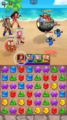Sega Heroes is a "match 3" game, where the player must match three or more tiles or shapes of the same color to score points and defeat enemies on the field.[4] There were five different colored tiles, and four of them that could control a character's actions and abilities. The player must select four characters of different colors (blue, green, red, and yellow)[4] in order to battle enemies in an event. Depending on the color of the character, the tiles that are matched determine if a character attacks an opponent. If the player matches three or more tiles of the same color together, it results in the hero of that color gaining energy and attacking an enemy of choice. The tiles come in four separate colors (for each color-type); red, green, yellow, and blue, as well as purple for boost. Matching purple tiles together increase the multiplier, resulting in the selected heroes becoming stronger. Matching four tiles together creates a star tile, while matching six tiles together creates another type of Star tile that explodes a piece of the board and activates a different ability. The MAX ability triggers a character's special move.
