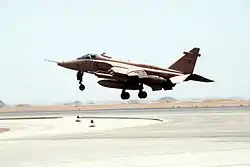 In support of the further military action in the region, known as Operation Manta, Jaguars were deployed to Bangui, Central African Republic, in 1983, before being rebased inside Chad at N'Djamena International Airport. On 25 January 1984, Jaguars attacked a rebel column that was withdrawing after raiding the town of Zigey. One aircraft was shot down and the pilot, Captain Michel Croci, was killed.[60] The "Manta" forces were withdrawn in 1984, as part of a de-escalation agreement, whereby both Libyan and French forces were to be withdrawn from Chad. The Libyans did not respect the agreement, and Jaguars returned to Chad in 1986, as part of Operation Epervier, this time with a more forceful role. On 16 February 1986, 11 Jaguars, escorted by Mirage F1 fighters and supported by C-135F tankers and Breguet Atlantic aircraft, launched a raid on the airfield at Wadi Doum, which the Libyans had constructed in Northern Chad, using BAP-100 anti-runway bombs.[61] In response to Libyan incursions, another strike was carried out on 7 January 1987, when a Jaguar destroyed a Libyan radar with a Martel missile.[59][62] The Jaguars stationed at Ndjamena were a target for Libyan sabotage owing to their effectiveness against enemy forces, but the attempts were unsuccessful.[63]