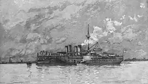 She was armed with a main battery of six 26 cm (10.2 in) guns, two of which were single-mounted in an open barbette forward of the conning tower and the remaining four mounted amidships, also on single mounts in an open barbette. As built, the ship was also equipped with six 8.7 cm (3.4 in) L/24 guns and eight 3.7 cm (1.5 in) Hotchkiss revolver cannons for defense against torpedo boats.[3][4]