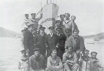 On the night of 12 May, U-6 headed out to try to intercept shipping between Santa Maria di Leuca and Valona.[11] Linienschiffsleutnant Hugo von Falkhausen, U-6's commander since November 1915,[4] attempted to pass underneath two drifters that formed a part of the Otranto Barrage. While submerged, von Falkhausen heard an unexplained noise on the hull of the boat, which was likely the sound of U-6 fouling one of the anti-submarine nets deployed from the drifter Calistoga. The drifter's skipper was alerted to the submarine's presence when one of the indicator buoys had fired. Calistoga launched signal flares that attracted the attention of two nearby drifters Dulcie Doris and Evening Star II. In the meantime, von Falkhausen surfaced U-6 to try to cut loose the buoy being dragged behind his boat. When the hatch was opened, the crew discovered the boat entangled in the net.[12]