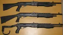 The Franchi SPAS-12 came equipped with a non-adjustable circular aperture rear sight and a large, non-adjustable blade foresight integrated into the barrel. The LAW-12 was a semi-automatic only and the SAS-12 was a pump action only. These three "sister" shotguns accepted all SPAS-12 components, notably trigger groups, barrel threaded attachments and stocks. The various magazine extension tubes of the LAW-12 and SAS-12 were never designed to be interchangeable with the SPAS-12 as this would cause issues with the gas selector switch moving from Auto to Pump action on the SPAS-12 model.[7] The extensions have been known to spin off the front of the SPAS-12 during cycling if the extension was not tapered for the SPAS-12 retaining pin.