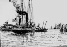 Columbia herself was ordered in July 1879 as Hull No. 193 at the John Roach & Sons Delaware River Iron Ship Building and Engine Works in Chester, Pennsylvania originally by the Oregon Steamship Company.[15] That same year, the Oregon Railway and Navigation Company had bought and merged the Oregon Steamship Company into its own operations.[16] Construction of Columbia began in September 1879.[17] Columbia was launched at 11:40 AM on February 24, 1880. Both the Bureau Veritas and American Shipmasters' Association oversaw her construction.[7][18][19] Roach himself refused to install the incandescent light bulbs on board Columbia in fear of a possible fire breaking out.[8] In May 1880, Columbia sailed to New York City, where Edison's personnel installed the new lighting systems.[7] The light bulbs were carried aboard in a shopping basket by Francis R. Upton, a chief assistant of Edison.[8] The first lighting of the ship took place on May 2, 1880.[8]