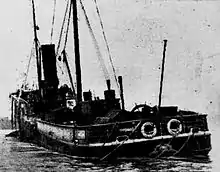The tide continued to ebb, causing Fenella to slip and heel over to port, exposing the damage incurred. Captain Mylchreest and his officers inspected the damage and found that a gash had been inflicted on her starboard side that was 10 inches (25.4 cm) long and 1 inch (2.54 cm) wide. The ship's carpenter managed to wedge and plaster the damage with clay so that it was rendered watertight.[17] Two other holes were subsequently discovered on the port side, one seven inches (17.8 cm) long and 1 inch (2.54 cm) wide and the other 15 inches (38.1 cm) long and 1 inch (2.54 cm) wide, which led to the engine room and aft hold respectively. Fenella′s master engaged the services of a pilot in order to assist with the situation, and at 19:00 hours Satanella arrived at the scene.[17]