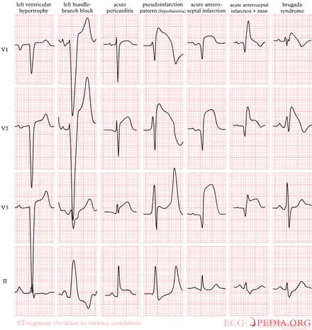 - Acute pericarditis[6][7] ST elevation in all leads (diffuse ST elevation) is more common with acute pericarditis.