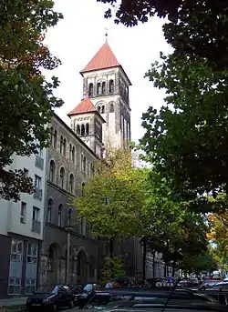 The Sacred Heart Church (German: Herz-Jesu-Kirche) is a Catholic church located in Berlin-Prenzlauer Berg, externally built in Neo-Romanesque style. Designed by Christoph Hehl, professor of medieval architecture, the building was completed after 16 months of constructions in 1898. The Neo-Byzantine-style murals inside the church were done by Friedrich Stummel.