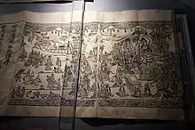The Buddha prophecies that in a future eon (kalpa) Śāriputra will become a Buddha called Padmaprabha. Śāriputra is happy to have heard this new teaching, but says that some in the assembly are confused.[44] The Buddha responds with the parable of the burning house, in which a father (symbolizing the Buddha) uses the promise of various toy carts to get his children (sentient beings) out of a burning house (symbolizing samsara).[52] Once they are outside, he gives them all one large cart to travel in instead. This symbolizes how the Buddha uses the three vehicles, as skillful means to liberate all beings – even though there is only one single vehicle to Buddhahood, i.e. the Mahāyāna. The sutra emphasizes that this is not a lie, but a compassionate salvific act.[53][54][44]