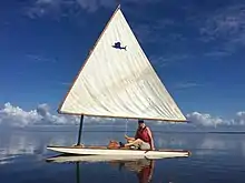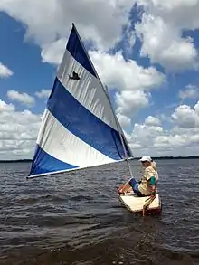 The Sailfish sailboat is a small, hollow body, board-boat style sailing dinghy. The design is a shallow draft, sit-upon hull carrying a crab claw sail mounted to an un-stayed mast. This style sailboat is sometimes referred to as a "wet boat" because, with its minimal freeboard, the sailor often gets splashed by spray as the boat moves across the water. This flat top was known in some coves as the "ironing board of the ocean."