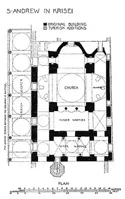 The building was originally of the ambulatory type, and is oriented in east-northeast - west-southwest direction. It has a central dome and a three apses, placed of the east side. An esonarthex and exonarthex are placed in the west side. On the other three sides the dome was originally surrounded by arcades surmounted by barrel vaults. During the Ottoman period the building underwent important alterations. The entrance is on the north side, where the Ottomans built an arcade covered by five domes. After the earthquake of 1766, the central dome was rebuilt. It is circular inside, octagonal outside, and rests on a high drum pierced by eight windows.[15]