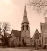 The present church building, built in 1872, was an American adaptation of the Oxford Movement in sanctuary design. Other features included coursed rows of rough-hewn blue limestone with stringcourses, sills and lintels of brownstone, stained-glass Gothic windows; and a bell tower with a stone steeple. Two heavy oak doors, painted red, are covered with elaborate scrolled pattern in bronze reminiscent of the Lichfield Cathedral in England. The foyer at the tower's base is decorated in the Arts & Crafts style, the ceiling have sixty small six-point stars cut into the ceiling and illuminated from above.[6] In December 1871, a fire in the town's business district destroyed the Federalist style sanctuary built in 1832 at the corner of Jonathan and Antietam Streets. The initial sanctuary space was sparsely, but tastefully, accommodated.
