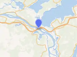 Completed in 2001 and opened to the public in October 2002, the bridge carries 4 lanes of the realigned Route 2 (Trans-Canada Highway).[2] Total length is 1000 m (0.61 mile) with multiple spans resting on concrete piers. The centre span is 120 m (400 ft) with an airdraft clearance of 60 m (200 ft) for navigational traffic.[1] It was built by the Maritime Road Development Corporation as part bg of a 230 km (140 mi) toll highway project..