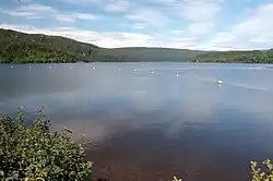 The Sainte-Marguerite-3 hydroelectric power station has a capacity of 882 MW. The 315 square kilometres (122 sq mi) canyon-type reservoir about 90 kilometres (56 mi) from the city of Sept-Iles was filled between 1998 and 2002.[17] The Denis-Perron dam is 171 metres (561 ft) high, and the reservoir is 140 kilometres (87 mi) long. The depth near the toe of the dam is around 120 metres (390 ft). The reservoir induced some minor earthquakes.[18] Another side effect, which had been anticipated, was a rise in mercury levels by factors of 6 to 8 in lake whitefish (Coregonus clupeaformis) and northern pike (Esox lucius), the main species of fish in the reservoir. Brook trout (Salvelinus fontinalis), the preferred fish for the local people, tend to avoid large reservoirs and were not affected. Mercury exposure to consumers stayed well below accepted levels.[17]