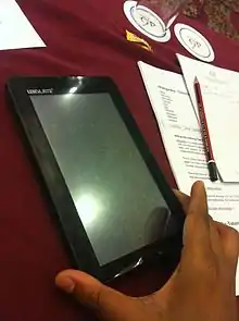 Aakash a.k.a. Ubislate 7+,[2] is an Android-based tablet computer promoted by the Government of India as part of an initiative to link 25,000 colleges and 400 universities in an e-learning program.[3] It was produced by the British-Canadian company DataWind,[4] and manufactured by the company, at a production center in Hyderabad. [5] The tablet was officially launched as the Aakash in New Delhi on 5 October 2011. The Indian Ministry of Human Resource Development announced an upgraded second-generation model called Aakash 2 in April 2012.[6]