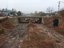 First phase of construction was focused on and around Peters Creek Parkway (NC 150), which included lowering the freeway to establish a minimum vertical clearance of 17 feet (5.2 m) at the new Fourth Street two-lane bridge and 17.5 feet (5.3 m) at the new seven-lane Peters Creek Parkway bridge. After two years of intermittent closures, the new Peters Creek Parkway bridge was opened on November 12, 2018.[34] [35] On November 17, the second phase began with the complete shutdown of Business 40 between Peters Creek Parkway and John Gold Memorial Expressway (US 52/US 311/NC 8); three alternate routes were set up through the downtown area for locals while travelers are encouraged to remain on mainline I-40.[36]