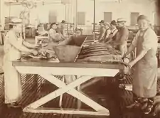 As mentioned above, many First Nations women came to the canneries with their husbands, fathers, or other male relatives. They were not idle during the canning season, but performed a number of important tasks within the cannery, similar to the tasks performed by the Chinese.[13] Women cleaned fish, packed them into tins, mended nets, and acted as nursemaids to the many children on site. They tended not to act as fishers, though some Native women may have accompanied their fathers on their boats, especially at a young age. Although women were paid for the work that they performed, their wages were among the lowest in the cannery.[20] Within the canneries, as many as 50% of the workers could be women, which suggests that the female labor force was necessary to the operation of many canneries.[20]