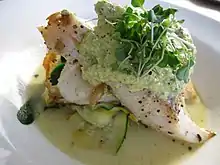 Salmoriglio is a southern Italian condiment made of lemon juice, olive oil, garlic, salt, and herbs (such as oregano and parsley).[1] It is common in Sicily[2] and Calabria[1][3] as an accompaniment to seafoods or meats,[2] especially swordfish.[3]