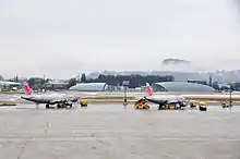 Terminal 2 is the much smaller one and features nine additional check-in counters and four boarding gates, as well as a designated area to check in skiing equipment.[8] It has limited passenger facilities due to its use for seasonal peak-time traffic.
