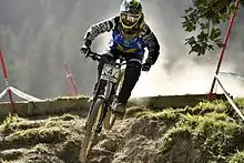 Sam Hill (born 21 July 1985 in Viveash, Western Australia), is an Australian professional enduro mountain biker and former professional downhill racer. He was two time consecutive UCI World Downhill Champion during years 2006–2007 for Iron Horse racing team.[1] He won the 2010 world championships in Mont Saint Anne, riding for the Monster Energy Specialized team on a Specialized Demo 8 II.[2] He also won the 2007 and 2009 UCI Elite Men's Downhill World Cup (Overall).[3] In December 2012 it was announced that Hill had signed for the Chain Reaction Cycles/Nukeproof team. As of 2016, Hill has switched to racing enduro and won the 2017 Enduro World Series overall title. In the same year he raced the Downhill World Championships in Cairns, Australia on his enduro bike where he finished sixth.