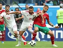 On 13 May 2018, Ghoddos was named in Queiroz's preliminary squad for the 2018 FIFA World Cup.[59] In an interview with Olof Lundh in May 2018, Ghoddos stated that if the Swedish federation had contacted him earlier, it's very likely for him to have chosen to represent Sweden, though he does not regret his decision to play for Iran.[60] Club teammate Emil Krafth later added that Ghoddos told him he wanted to play for Sweden.[61][62] He was named in Iran's final 23-man squad for the 2018 World Cup on 4 June 2018.[1] Ghoddos made his World Cup debut against Morocco on 15 June 2018, winning a free kick that led to a goal for Iran’s first World Cup win in twenty years.[63] He was used as a substitute in all three World Cup matches against Morocco, Spain and Portugal.[64] After the World Cup in November 2018, Ghoddos faced conscription issues in Iran.[65]