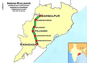 The 18301 / 02 Intercity Express runs from Sambalpur Junction via Titlagarh Junction to Rayagada.