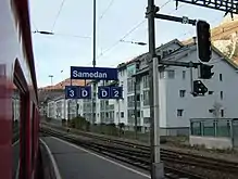 Samedan railway station is a railway station in the municipality of Samedan, in the Swiss canton of Graubünden. It is an important interchange station on the Rhaetian Railway network between the Albula Railway line (between Chur and St. Moritz) and the Samedan–Pontresina railway.[1] Hourly services operate on each line.