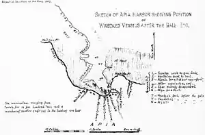 The sketch features the locations of the wrecked German and American ships.