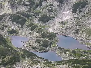 The Samodivski Lakes (Bulgarian: Самодивски езера) is a small group of lakes in Pirin, southwestern Bulgaria, part of the larger group of Popovski lakes. They are situated very close to each other in a small cirque to the south west of the Popovo Lake between the peak Dzhengal, Momin Dvor and Kralev Dvor. They are situated at an altitude of 2,373 m, 2,375 m, 2,372 m. The highest has a shape of a boat with size of 75x85 m and surface of 3,20 decares; the second one resembles a kidney and is longer (100x35 m) with area of 2,20 decares; the lowest is also the smallest one with size of 50x20 m and surface of only 1 decare. The Samodivski lakes are considered as one of the most beautiful in Pirin and with good reason: they are nestled among high rocks, a small stream curves between them which even forms a tiny waterfall between the higher lakes. They names derives from the folklore beliefs that the wood nymphs gather around at night. According to the legend, the area was home of the daughter of the Slavic god Perun. The track between the Bezbog refuge and the Tevno Lake passes nearby. There are suitable places for camping.