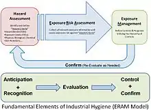 Occupational hygiene (United States: industrial hygiene (IH)) is the anticipation, recognition, evaluation, control, and confirmation of protection from hazards at work that may result in injury, illness, or affect the well being of workers. These hazards or stressors are typically divided into the categories biological, chemical, physical, ergonomic and psychosocial.[1] The risk of a health effect from a given stressor is a function of the hazard multiplied by the exposure to the individual or group.[2] For chemicals, the hazard can be understood by the dose response profile most often based on toxicological studies or models. Occupational hygienists work closely with toxicologists (see Toxicology) for understanding chemical hazards, physicists (see Physics) for physical hazards, and physicians and microbiologists for biological hazards (see Microbiology Tropical medicine Infection) Environmental and occupational hygienists are considered experts in exposure science and exposure risk management. Depending on an individual's type of job, a hygienist will apply their exposure science expertise for the protection of workers, consumers and/or communities.