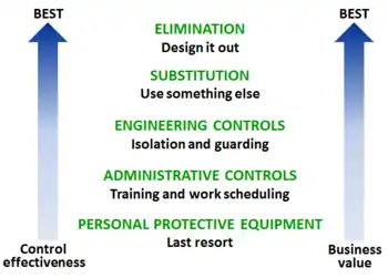 The hierarchy of control defines the approach used to reduce exposure risks protecting workers and communities. These methods include elimination, substitution, engineering controls (isolation or ventilation), administrative controls and personal protective equipment. Occupational hygienists, engineers, maintenance, management and employees should all be consulted for selecting and designing the most effective and efficient controls based on the hierarchy of control.
