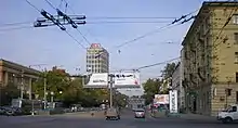 School bears the name of a Soviet World War II hero officer Mikhail Kharchenko and stands along the street of his name, with entrance facing the corner of Kantemirovskaya Street.