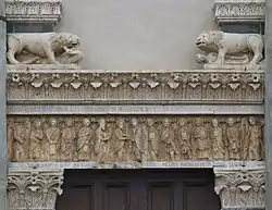 The church gained its present appearance at the time of Buono in 1159, rebuilt in the Pistoiese Romanesque style. Characteristic of this style is the façade, divided into five compartments with arches supported by slender columns, and with a marble bichrome decoration. The portal in the facade is graced with notable Romanesque sculptures; the architrave has a row of standing individuals in togas, depicting "Jesus with the Twelve Apostles" (dated to 1167). Above are two male lions, one atop a guarding a recumbant man, the other atop a bird. Above the portal is a latin script.