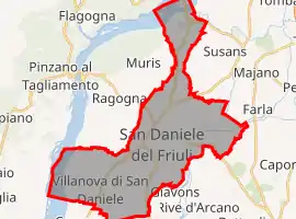 San Daniele del Friuli borders these municipalities: Dignano, Forgaria nel Friuli, Majano, Osoppo, Pinzano al Tagliamento, Ragogna, Rive d'Arcano, and Spilimbergo.