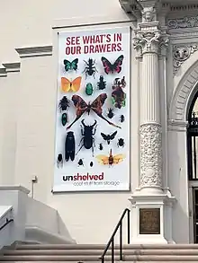 In 2017, the Museum drew on the abundance of material in its collections to create the new exhibition, Unshelved – Cool Stuff from Storage.[41] Specimens curated by the several departments that comprise the Biodiversity Research Center of the Californias (BRCC) contributed. Meticulously preserved and catalogued material from the research collections of Birds and Mammals, Botany, Entomology, Herpetology, Marine Invertebrates, Mineralogy, Paleontology, and the Research Library provides a "backstage" view into the Museum's remarkable holdings.[42]