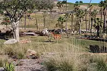 The park's largest exhibits, covering over 300 acres (120 ha),[16] are the open-range enclosures. Visitors view various plains habitats from Africa and Asia. Asian Savanna covers 60 acres (24 ha) and displays Indian rhinoceros, Bactrian camels, banteng, gaur, argali, mouflon, dholes, Sarus cranes, and several species of Asian deer and antelope such as blackbuck, barasingha, sika deer, axis deer, Eld's deer, Père David's deer, nilgai, hog deer, white-lipped deer, sambar, and wapiti.[16] African Plains represents many regions and habitats. East Africa displays cape buffalo, southern white rhinoceros, Rothschild's giraffe, reticulated giraffe, beisa, fringe-eared oryx, waterbuck, Nile lechwe, red lechwe, impala, Grant's gazelle, Thomson's gazelle, and a lagoon with East African crowned cranes, Dalmatian pelicans, African sacred ibises and great white pelicans.[16] The North Africa exhibit represents the Sahel and Sahara that houses scimitar-horned oryx, barbary stag, red-fronted gazelle, Barbary sheep and Ankole-Watusi cattle.[16] The Southern Africa field exhibits Grévy's zebras, waterbucks, kudus and an Ankole-Watusi. The South Africa field exhibit holds Masai giraffes, common eland, sable antelope, gemsbok, springbok, blue wildebeest, blesbok, and ostrich.[17] The Central Africa region features a wooded waterhole with an island for pink-backed pelicans, saddle-billed storks, Lappet-faced vultures, spur-winged geese, Goliath herons, and Rüppell's vultures. On the shores of the lake are bongo antelope, red river hog, greater kudu, Ugandan kob, grey rhebok, roan antelope, and other forest animals.[17] A number of smaller enclosures visible only from the tram are home to Somali wild ass, Nubian ibex, kiangs, Arabian oryx, bharal, gorals, Japanese serows, markhor, Soemmerring's gazelles, black rhinoceroses, Slender-horned gazelles, and Przewalski's horses.
