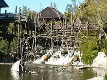 Opened in October 2004, Lion Camp houses the park's six African lions, Izu, Mina, Oshana, Etosha, Ken and Dixie, in a 1-acre (0.40 ha) exhibit.[27] The park's two other lions, Ernest and Miss Ellen, were moved to the San Diego Zoo. One side of the enclosure is dominated by an artificial rock kopje which has a 40-foot-long (12 m) glass viewing window and heated rocks.[27] The path continues along an acacia-studded ravine and leads to a replica observation tent. This has a smaller viewing window as well as a Land Rover for the lions to rest on.