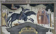The interior with a single nave has a collection of frescoes from the 15th and 16th centuries. Including Scenes from the Life of St Francis by Bartolo di Fredi and Taddeo di Bartolo. The first altar right of main altar has a fresco depicting a grim Triumph of Death by Bartolo; in the painting, death as a horseman, dressed in black on a black horse, bears upon two conversing noblemen. There is a large polyptych of Madonna and Saints by Luca di Tomme.[2]