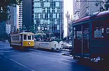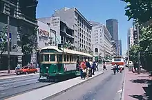 The San Francisco Historic Trolley Festival was a heritage streetcar service along Market Street in downtown San Francisco, California, that used a variety of vintage streetcars and operated five to seven days a week, primarily in the summer months, between 1983 and 1987.[3] Operated by the San Francisco Municipal Railway (Muni), the city's primary transit agency, and co-sponsored by the city's Chamber of Commerce and various corporate and private donors, it was the predecessor of the F Market & Wharves streetcar line that opened in 1995.[4] It used historic streetcars/trolleys – these two terms are synonyms in most parts of the United States[5] – from several different countries, as well as a number of preserved San Francisco streetcars, many of which were borrowed from museums. The impetus behind the Trolley Festival was that the city's famous cable car system, one of its biggest tourist attractions, was due to be closed for 20 months (this ended up stretching to 21 months)[6] starting in September 1982 for a needed rebuilding of its aging infrastructure. Local business owners and city officials were very concerned that the temporary absence of the cable cars would lead to a sharp decline in tourism,[7][8] especially during the one summer season included in the 20-month period.