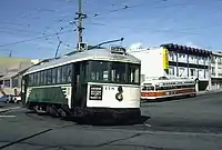 ![]() Blackpool "boat" car 226 passing Muni car No. 1 on 17th Street in July 1983 | |