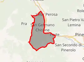 San Germano Chisone (French: Saint-Germain) is a comune (municipality) in the Metropolitan City of Turin in the Italian region Piedmont, located about 40 kilometres (25 mi) southwest of Turin. San Germano Chisone borders the following municipalities: Inverso Pinasca, Villar Perosa, Pramollo, Porte, Angrogna, San Secondo di Pinerolo, and Prarostino.