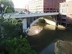 Houston constructed a new bridge on San Jacinto in 1914. The area just north from downtown, the Fifth Ward, was a burgeoning industrial area separated from downtown by Buffalo Bayou. Mayor Horace Baldwin Rice was an advocate of the City Beautiful movement, thus was motivated by aesthetic considerations in choosing a bridge design.[1] The new bridge facilitated river traffic with a large “barrel arch ring,” which also contributed to the bridge's appearance and its application of City Beautiful principles. William P. Carmichael Company of St. Louis executed the design of E. E. Sands, an engineer working for the City of Houston. They used reinforced concrete for most of the bridge elements, while pedestrians accessing the bridge walked among the “sidewalk brackets, curved fascia walls and urn balustrade railings.” The “open spandrel concrete arch” is a representative design feature of bridges built during this period, and there were 23 such bridges in Texas still extant in 2007.[2] The bridge spans 325 feet and is in part supported by twenty-foot pilings. A fifty-foot roadbed is flanked by ten-foot cantilevered sidewalks.[1]