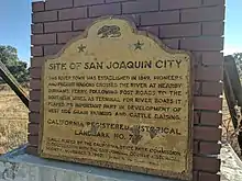 San Joaquin City (Spanish: San JoaquĆn, meaning "St. Joachim") is a former settlement in San Joaquin County, California. It was established in 1849, during the California Gold Rush.[2] It was located on the west bank of the San Joaquin River just below the point where Airport Way (formerly Durham Ferry Road) crosses the river today. It was an important settlement along the old River Road (now Kasson Road in San Joaquin County) between Banta and Grayson's Ferry (now the community of Grayson in Stanislaus County.[3]