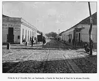 The shooting at first accounted for as many friends as enemies, but after white badges bearing the name "Unionista" were distributed, the fire was more effective.[8] A few hours later all males in the city were wearing that token in their hat, and there were even some that had a portrait of the new president on their chest. On the government side, steady fire was maintained from "La Palma" and the two forts of San José and Matamoros. Cars with the Red Cross flag dashed incessantly, carrying a sister on the footboard with her medical supplies on one hand and a machete stuck in her belt.[9]