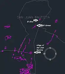 Other neighboring village in this district are El Olivo, and El Carmen (not to be confused with another District of the same name in the Chincha province of Ica). Both of these villages are approximately 8 to 10 kilometers north of village of San Juan Bautista.