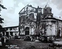 The church is the site of the Battle of San Rafael, a battle fought between Filipino revolutionaries under the leadership of General Anacleto “Matanglawin” Enriquez against the Spanish army headed by Commandant Lopez Arteaga.[3] On their way from the town of Paombong, Bulacan to the mountain ranges of Bulacan, General Isidoro Torres of Malolos decided to divide the troop of Katipuneros into two: one group under his supervision while the other under the guidance of General Enriquez and his brother Colonel Vicente Enriquez. The group of General Enriquez was supposedly heading to the town of Baliuag, Bulacan but decided to stay instead in San Rafael, believing it to be a strategic site. Unknowingly, a Spanish troop from Manila heading towards San Rafael, prepared to silence the 20,000 Filipino insurgents. The battle started at around 7 a.m. on November 30, 1896. The Spanish forces were so strong that General Enriquez ordered a retreat to the church of San Rafael. Sometime in the middle of the battle, some of the Filipino troops including Colonel Enriquez were separated from the rest of the group and headed to the town of Bigaa (now Balagtas). At around noon, the Spanish army forced the church doors open and murdered the Filipino revolutionaries seeking shelter in the church. It is estimated that 800 people were killed in the battle, most of whom were children, women and other locals. The number of casualties was so immense that it was believed that blood spilled in the church reached ankle-deep.[1] The gobernadorcillo of San Rafael ordered a mass grave to be made near the church.[4] It is believed that the Battle of San Rafael inspired the young general Gregorio Del Pilar (a close friend of General Anacleto Enriquez) to join the revolution against Spain.[3]